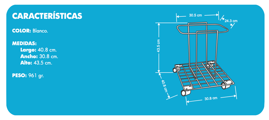 La Canastilla para recolector SUJE-30-C está equipada con cuatro ruedas giratorias, por lo que el desplazamiento del contenedor se vuelve ágil y sin complicaciones. Esto permite transportar los residuos sin necesidad de levantarlos manualmente, reduciendo el riesgo de accidentes y evitando el contacto directo con el contenido.