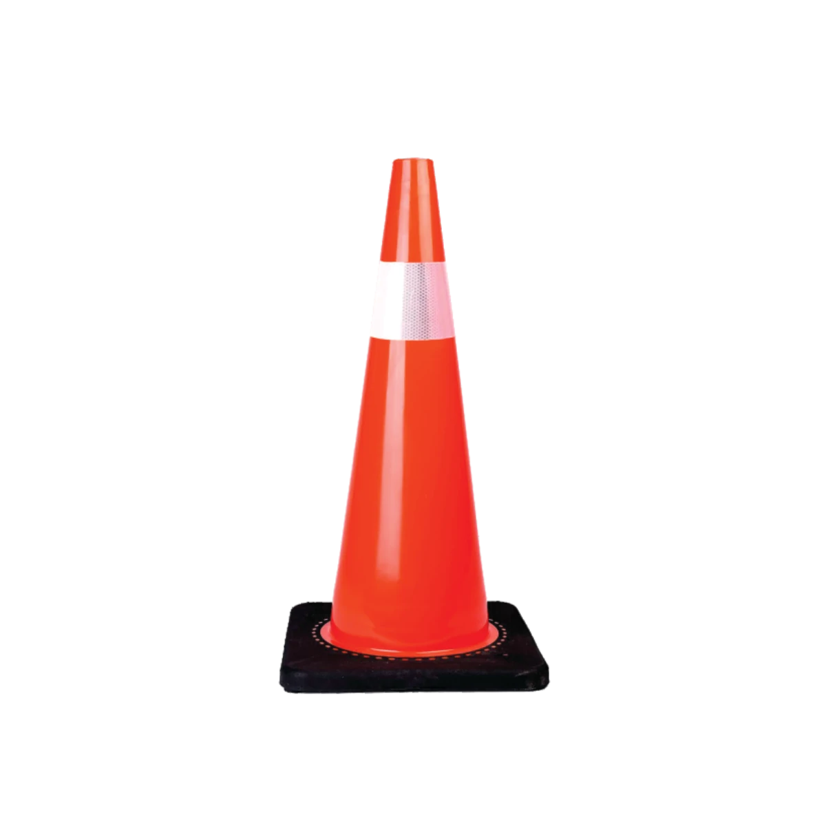 Equipado con una base pesada de PVC macizo que le permite mantenerse firme en su lugar, evitando vuelcos incluso en condiciones adversas. Además, su anillo reflectante y opcional de bandas reflejantes aumentan la visibilidad nocturna, alertando a los conductores y mejorando la seguridad en condiciones de poca luz.