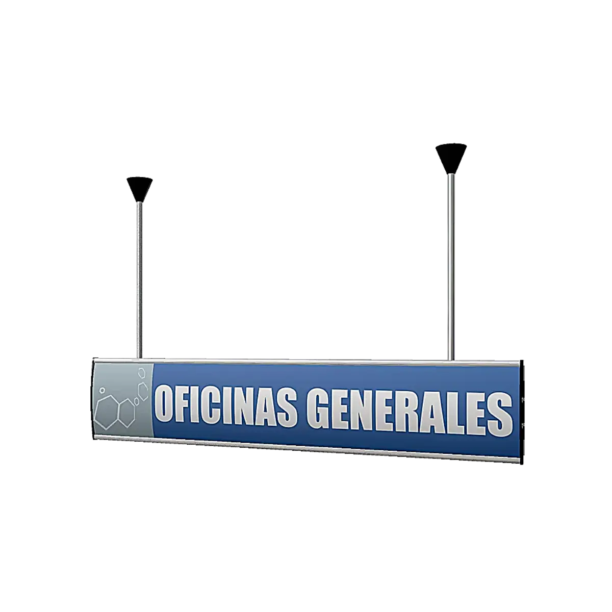 Especiales para colgarse de techos, plafones, escaleras, etc. Son de gran tamaño y especiales para orientar sobre algún sitio en específico. Incluye película antirreflejante. Fabricado en perfil de aluminio natural, anodizado, satinado, curvo extruido. Medidas: 15×75 cm. Con opción a ser fotoluminiscente y diseñado con los colores de tu empresa.