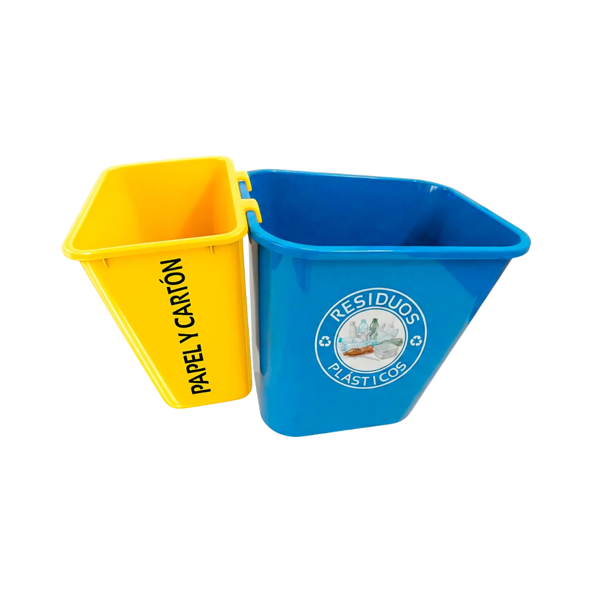 En el día a día, este modelo se adapta a espacios donde el movimiento es constante y el espacio es limitado. Escritorios, áreas comunes, salas de trabajo o zonas administrativas encuentran en esta papelera una solución compacta y fácil de integrar. Cada contenedor tiene un uso definido, lo que reduce errores por costumbre y evita que los residuos se mezclen. Los ganchos mantienen ambas unidades firmes y alineadas, permitiendo moverlas o vaciarlas sin complicaciones cuando llega el momento de la recolección.