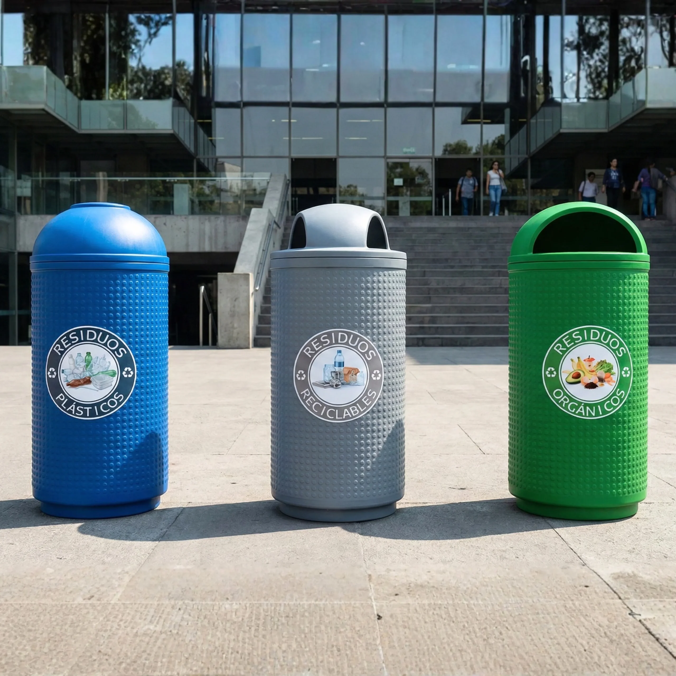 Diseñada para soportar las condiciones más exigentes, cuenta con protección contra rayos UV y resistencia a cambios climáticos, asegurando su durabilidad y apariencia intacta por mucho tiempo. Su tapa con entrada superior y bisagra facilita el depósito de residuos, mientras que el soporte en la base evita que se voltee con el viento, ofreciendo estabilidad y practicidad en todo momento.